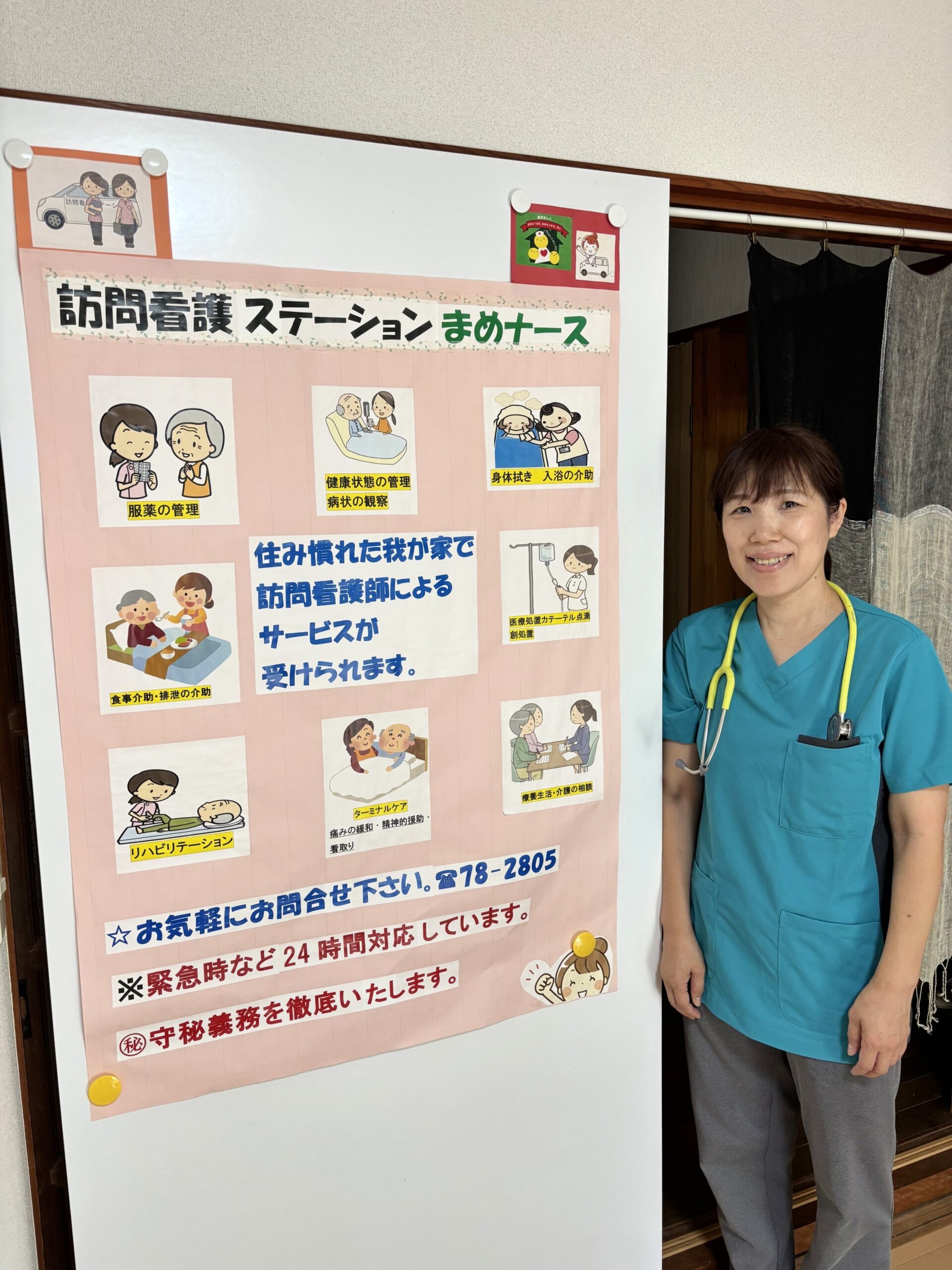 - お一人お一人が自分らしく、望まれる時に望まれる場所で必要な看護を受け、安心・安全に生活を送っていただけるように努めています。まめナースの看護職、リハビリ職、そして新たに加わる介護タクシースタッフが力を合わせ、これまで以上に質の高い、あたたかいサービスを地域に届けていきたいと思います!